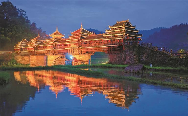 6月11日,三江侗族自治县林溪镇程阳八寨景区流光溢彩,宛若仙境。夜幕下,灯光与建筑交相辉映,传统与现代共舞,自然与人文交融,吊脚楼群灯火如星,似金色音符散落侗乡;风雨桥横跨碧水,像流光琴弦弹奏夜曲;远山含黛,与璀璨灯火、粼粼波光交融,织就一幅“古寨披辉、桥影漾金、山水和鸣”的绝美画卷。